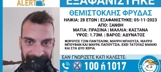 Ο 28χρονος Θεμιστοκλής Φρύδας έχει εξαφανιστεί από την Ξάνθη στις 5 Νοεμβρίου, όπως έκανε γνωστό σήμερα το Χαμόγελο του Παιδιού.
