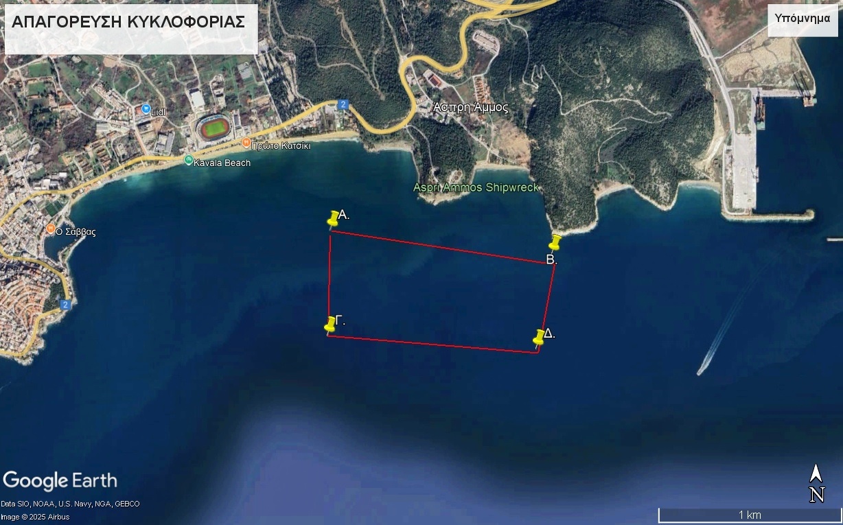 1. Την α π α γ ο ρ ε ύ σ η  της διέλευσης  σκαφών,  καθώς και κάθε  αλιευτική – ψυχαγωγική δραστηριότη- τα (επαγγελματική – ερασιτεχνική) και της λήψης θαλάσσιου λουτρού από 14:00 της 29-06-2025 και μέχρι νεωτέρας, λόγω υδροληψίας ,  στον θαλάσσιο χώρο της Π.Ε. Καβάλας και  συγκεκριμένα της θαλάσσιας  περιοχής  Περιγιαλίου  και  Άσπρης Άμμου  που περικλείεται  από τα παρακάτω στίγματα: