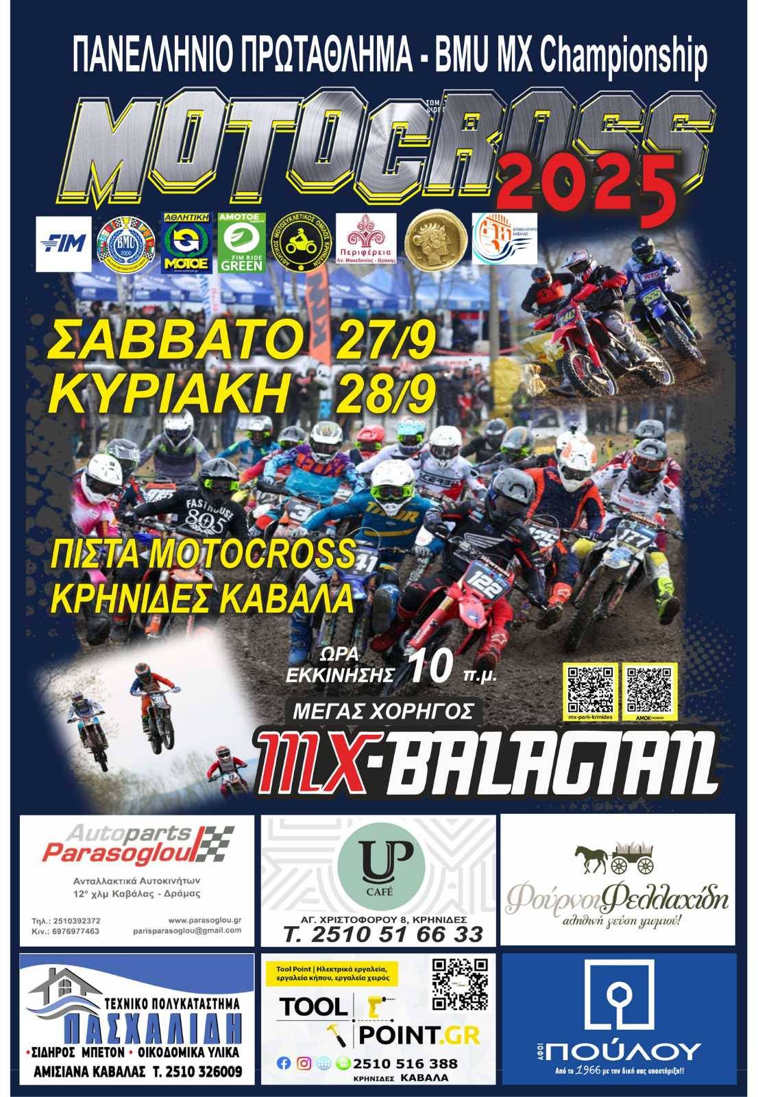Με τη συμμετοχή τουλάχιστον 200 αθλητών και με τη φιλοδοξία να εδραιωθεί περαιτέρω η Καβάλα ως «μητέρα του μηχανοκίνητου αθλητισμού», ξεκινά το διήμερο 27 και 28 Σεπτεμβρίου 2025 στις Κρηνίδες η μεγάλη διοργάνωση BMU MX Championship Motocross 2025. Ο αγώνας, που συνδυάζει τον 5ο Πανελλήνιο και τον 7ο Βαλκανικό αγώνα motocross, αναμένεται να προσελκύσει έντονο ενδιαφέρον, αναδεικνύοντας παράλληλα τη δυναμική της ευρύτερης περιοχής.