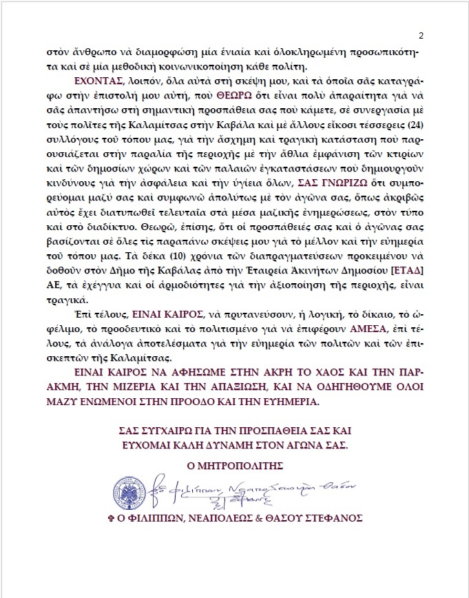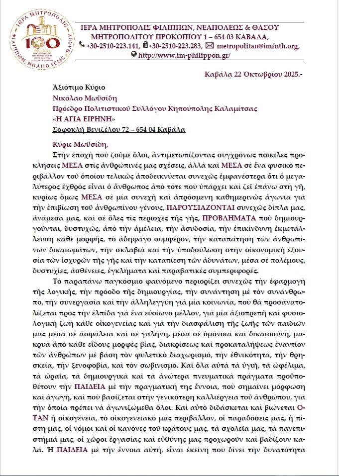 Το “Χ” δημοσιεύει σήμερα την επιστολή – παρέμβαση του Μητροπολίτη Φ.Ν.Θ. κ. Στεφάνου προς τον Σύλλογο της Καλαμίτσας – Κηπούπολης και αφορά τον αγώνα των Καβαλιωτών για την Καλαμίτσα και ο λόγος που συμβαίνει αυτό είναι, γιατί απλά θέτει το θέμα στην σωστή του βάση και δίνει αφορμές για πολλούς προβληματισμούς. Να τον ευχαριστήσουμε και δημόσια που ανταποκρίθηκε στο αίτημα μας να μας την εμπιστευτεί και να μας επιτρέψει την δημοσιοποίηση του συνόλου του κειμένου: