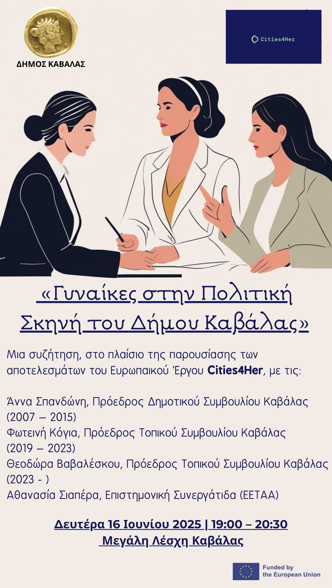 Μία συζήτηση, στο πλαίσιο της παρουσίασης των αποτελεσμάτων του Ευρωπαϊκού Έργου Cities4Her, με θέμα «Γυναίκες στην Τοπική Πολιτική Σκηνή», θα πραγματοποιηθεί τη Δευτέρα 16 Ιουνίου 2025, στις 18:30, στη Μεγάλη Λέσχη Καβάλας.