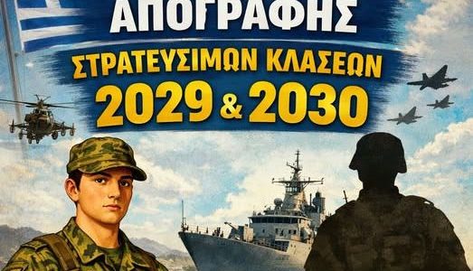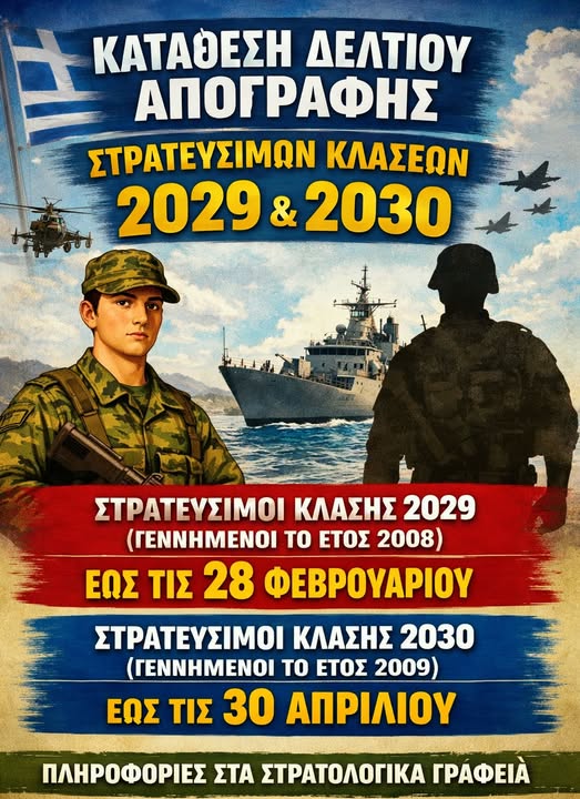 Οι στρατεύσιμοι της κλάσεως 2029 (γεννημένοι το έτος 2008) υποχρεούνται, σύμφωνα με το άρθρο 242 παρ. 3 του σχετικού νόμου, να καταθέσουν Δελτίο Απογραφής (ΔΑ) κατά το πρώτο δίμηνο του έτους 2026, ήτοι έως και τις 28 Φεβρουαρίου 2026. Επισημαίνεται ότι οι προγενέστερες ημερομηνίες (έως 31 Μαρτίου), παύουν να ισχύουν.