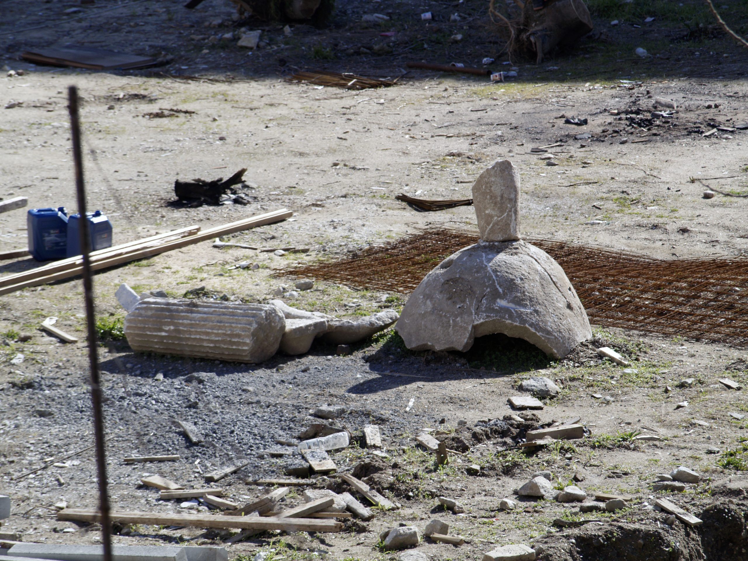 Συγκεκριμένα σε εργασίες εκσκαφής που έγιναν στην δυτική πλευρά της αυλής, βρέθηκαν τα θραύσματα μεγάλης μαρμάρινης φιάλης και ένα μαρμάρινος κίονας με ραβδώσεις. Αξίζει να σημειώσουμε ότι δεν είναι η πρώτη φορά που η αυλή του εν λόγω σχολείου δίνει σοβαρά αρχαιολογικά ευρήματα, αφού από χρόνια στην δυτική πλευρά έχουν εναποτεθεί τρία τμήματα κιόνων χωρίς ραβδώσεις που χρονολογούνται και ως οι παλαιότεροι. Στην φωτογραφία φαίνονται τα τρία τμήματα της μαρμάρινης φιάλης και ο κίονας, τοποθετημένα δίπλα από το σημείο που βρέθηκαν.
