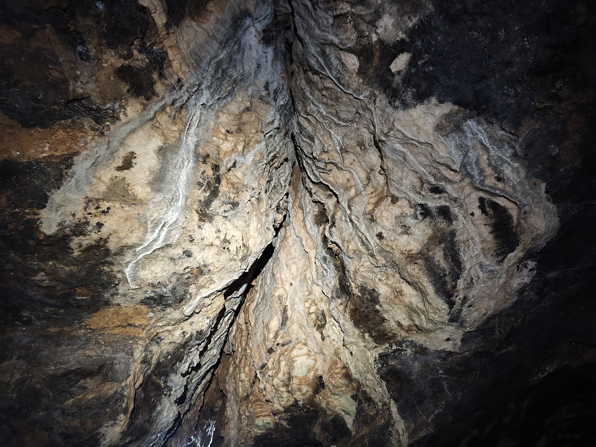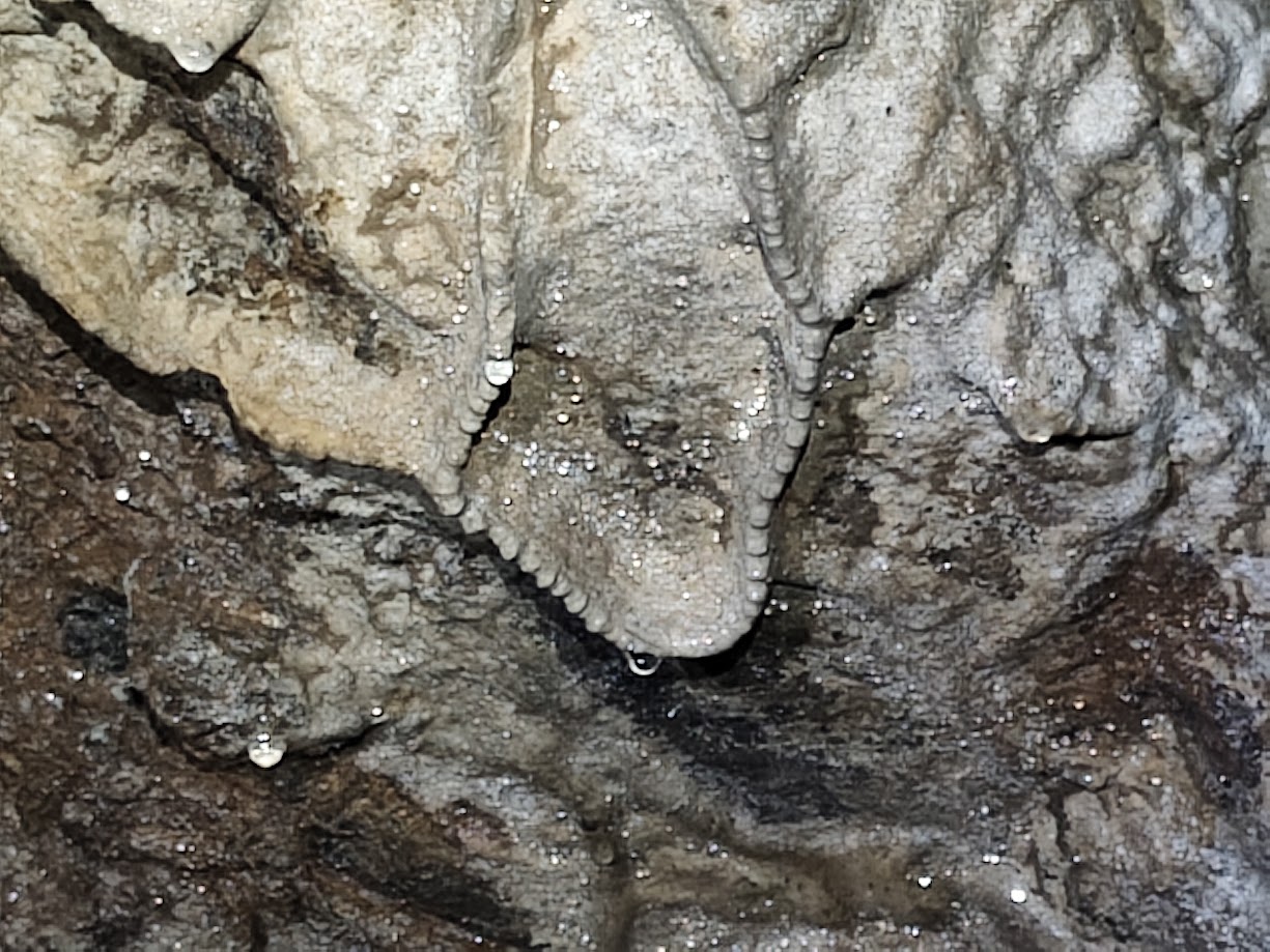 Σε άλλες εικόνες, λεπτές σταλακτιτικές απολήξεις κρέμονται από την οροφή, σχηματισμένες αργά, σταγόνα τη σταγόνα. Το νερό, αόρατο αλλά επίμονο, έχει χαράξει ραβδώσεις και αυλακιές που θυμίζουν υφαντό ή γραφή σε άγνωστη γλώσσα. Κάθε σταγόνα είναι χρόνος. Κάθε κρυστάλλωση, μια σιωπηλή πράξη δημιουργίας.