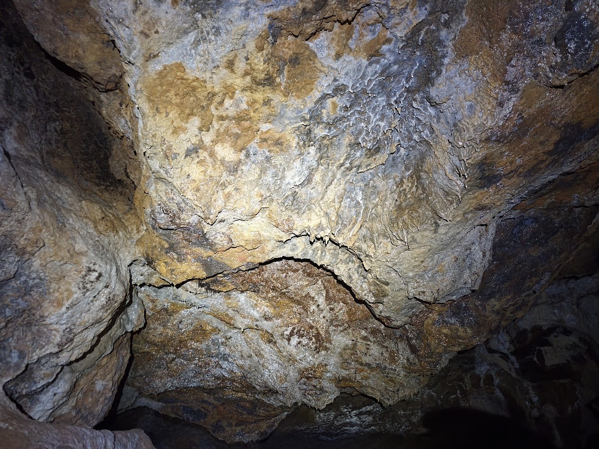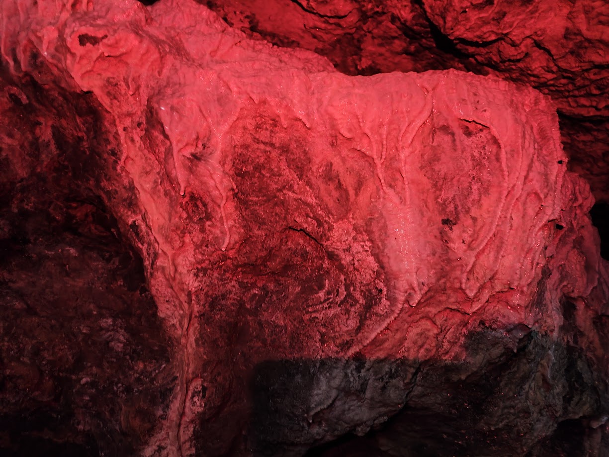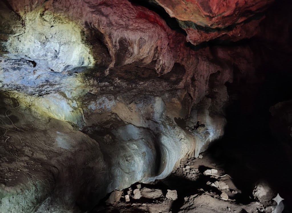 Σε κάποιες στοές, τα τοιχώματα έχουν χρωματιστεί από τις οξειδώσεις και τα ορυκτά σε αποχρώσεις που θυμίζουν παλέτα ζωγράφου: γαιώδη κόκκινα, ψυχρά γαλάζια, υποψίες πράσινου και μαύρου. Το φως του φακού πέφτει πάνω τους και αποκαλύπτει μια γεωλογία που μοιάζει σχεδόν οργανική, σαν δέρμα που αναπνέει μέσα στο σκοτάδι. Εκεί όπου κάποτε ο άνθρωπος αφαίρεσε ύλη, η φύση επέστρεψε μορφή.