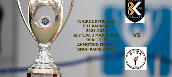 Η Επιτροπή Κυπέλλου της Ένωσης Ποδοσφαιρικών Σωματείων Καβάλας αποφάσισε τον ορισμό του τελικού του Κυπέλλου της ΕΠΣ Καβάλας 2021-2022 για τη Δευτέρα 2 Μαΐου 2022, στις 17:30 στο Δημοτικό Γήπεδο “Ανθή Καραγιάννη”.