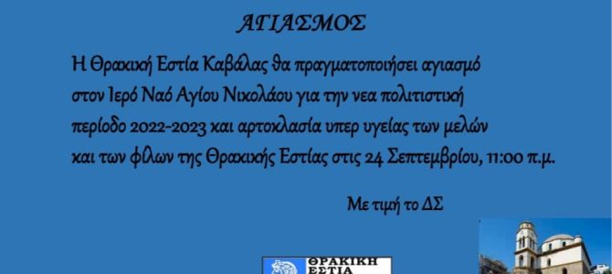 Η Θρακική Εστία Ν. Καβάλας θα πραγματοποιήσει αυτό το Σάββατο 24 Σεπτεμβρίου 2022 και στις 11 το πρωί Αγιασμό και αρτοκλασία υπέρ υγείας των μελών και των φίλων της Θρακικής Εστίας στον Ιερό Ναό του Αγίου Νικολάου Καβάλας, για τη νέα πολιτιστική περίοδο 2022 -2023.