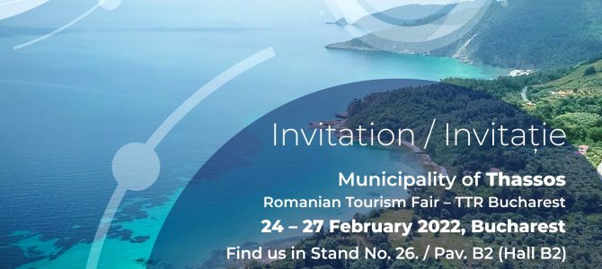 Ο Δήμος της Θάσου, συνεπής στη δέσμευση του να συνδράμει με κάθε πρόσφορο μέσο στην προβολή του τόπου μας, θα συμμετέχει και φέτος στη Διεθνή Τουριστική Έκθεση «TTR Bucharest 2022», η οποία πραγματοποιείται από 24 έως 27 Φεβρουαρίου 2022 στο Βουκουρέστι της Ρουμανίας.