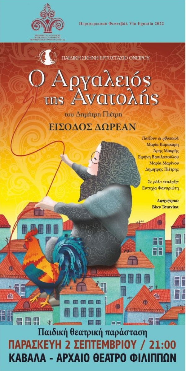 Η Περιφέρεια Ανατολικής Μακεδονίας Θράκης/ΠΕ Καβάλας στο πλαίσιο του Περιφερειακού Φεστιβάλ Via Egnatia 2022, διοργανώνει παιδική θεατρική παράσταση με τίτλο: «Ο Αργαλειός της Ανατολής» του Δημήτρη Πιέτρη, με την Παιδική Σκηνή Εργοστάσιο Ονείρου, την Παρασκευή 02 Σεπτεμβρίου και ώρα 21:00, στο αρχαίο θέατρο των Φιλίππων, με δωρεάν είσοδο.