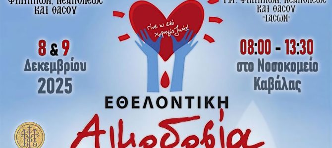 Σας προσκαλούμε, λοιπόν, όλους εκ νέου σε μία σταυροφορία ζωής για την ζωὴ των αδελφών μας, την Δευτέρα και την Τρίτη, 8 και 9 Δεκεμβρίου, στην υπηρεσία αιμοδοσίας του Νοσοκομείου της Καβάλας και στο καθορισμένο ωράριο προσελεύσεως από τις 8.30 το πρωΐ  έως τις 1.30 το μεσημέρι, όπου δύνασθε να καταθέσετε, όσοι δεν έχετε πρόβλημα υγείας και μόνο με την σύσταση των ιατρών, λίγες σταγόνες αίματος στην τράπεζα της Ιεράς Μητρο­πόλεώς μας, σαν μία θυσία ζωής και προσφορά αγάπης.