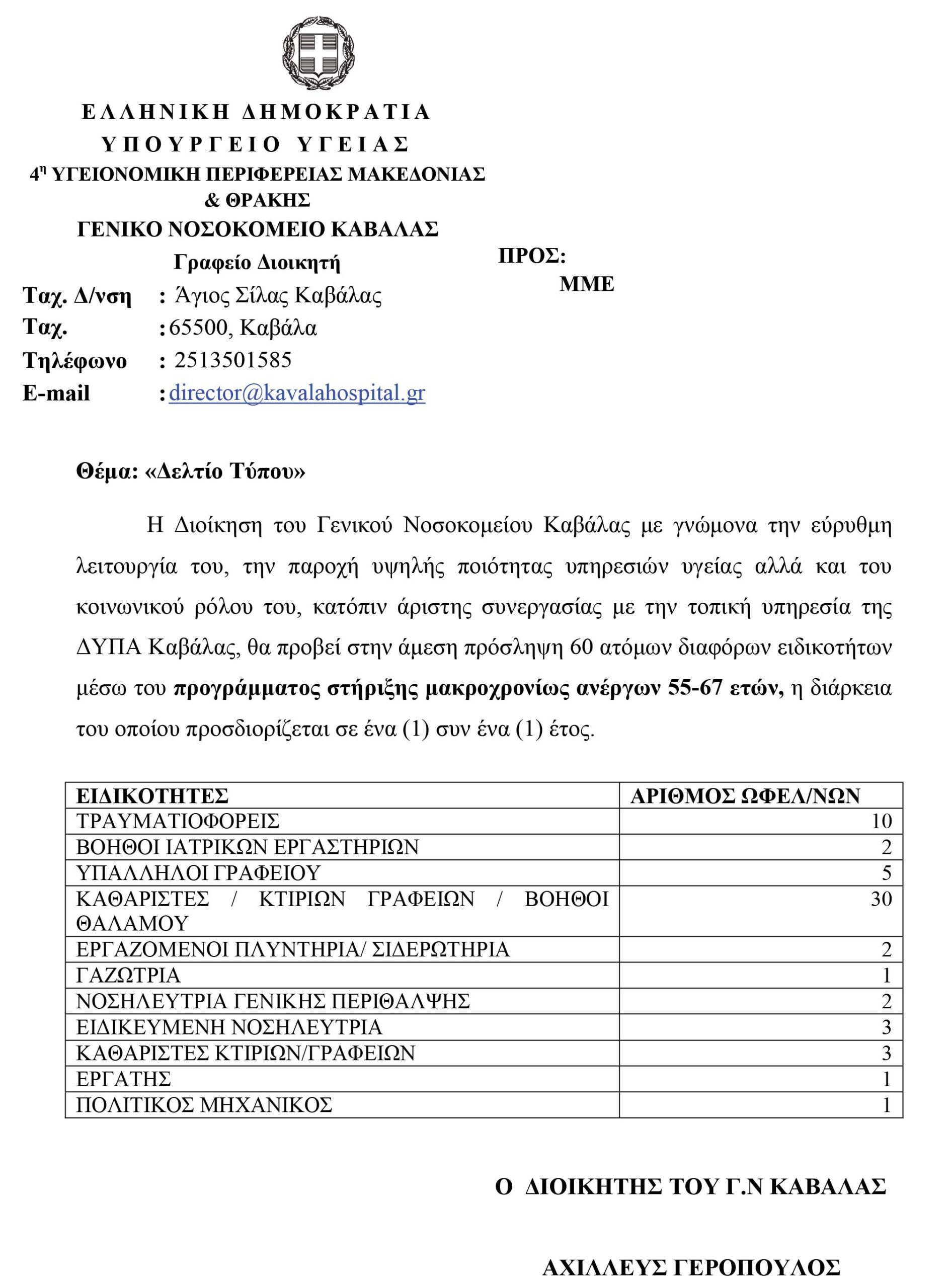 Η Διοίκηση του Γενικού Νοσοκομείου Καβάλας με γνώμονα την εύρυθμη λειτουργία του, την παροχή υψηλής ποιότητας υπηρεσιών υγείας αλλά και του κοινωνικού ρόλου του, κατόπιν άριστης συνεργασίας με την τοπική υπηρεσία της ΔΥΠΑ Καβάλας, θα προβεί στην άμεση πρόσληψη 60 ατόμων διαφόρων ειδικοτήτων μέσω του προγράμματος στήριξης μακροχρονίως ανέργων 55-67 ετών, η διάρκεια του οποίου προσδιορίζεται σε ένα (1) συν ένα (1) έτος.
