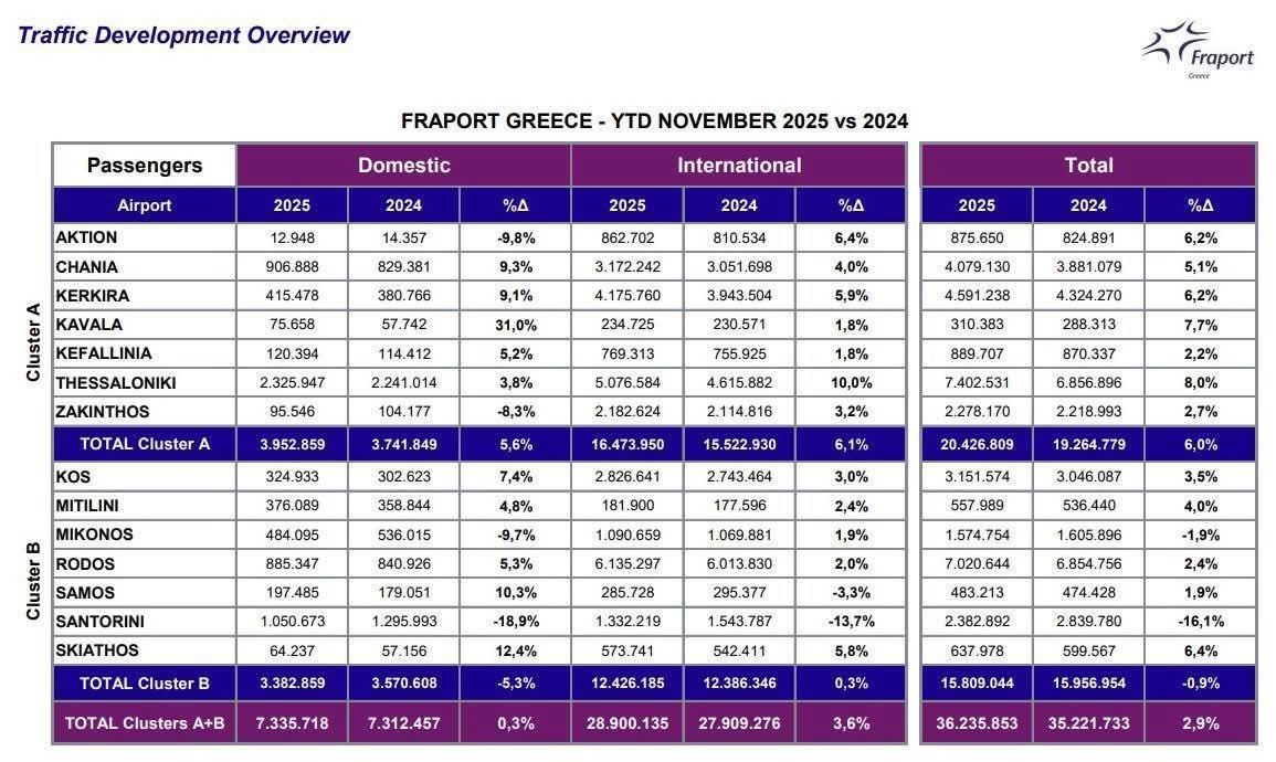Μια εξαιρετική χρονιά για τις αερομεταφορές και τον τουρισμό της περιοχής ολοκληρώθηκε, καθώς τα επίσημα στοιχεία της Fraport Greece για το 2025 επιβεβαιώνουν τη δυναμική τροχιά ανόδου των 14 περιφερειακών αεροδρομίων της χώρας. Συνολικά, τα αεροδρόμια υποδέχθηκαν πάνω από 37 εκατομμύρια επιβάτες, σημειώνοντας μέση αύξηση 3% σε σχέση με το 2024.