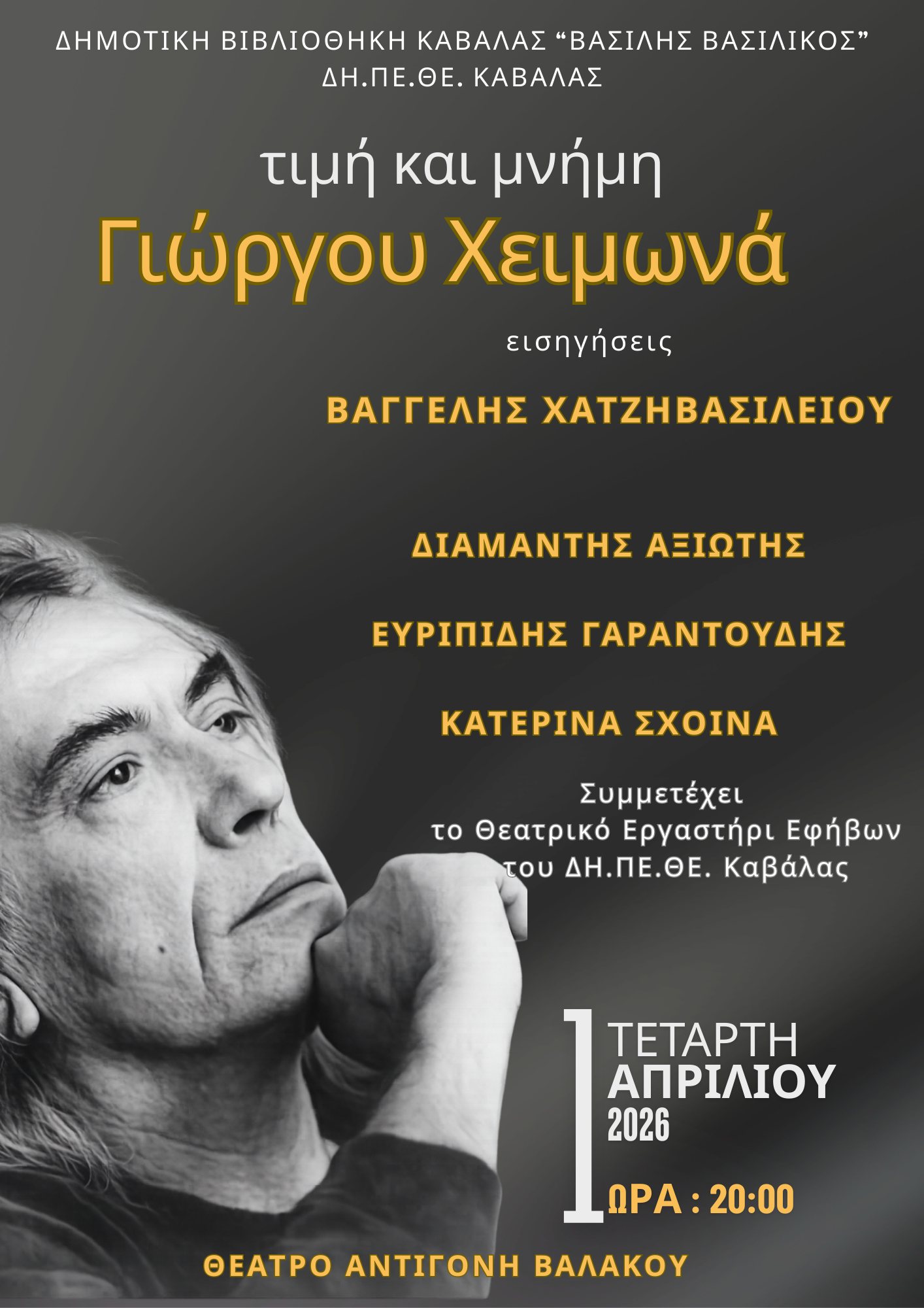 Τετάρτη 1 Απριλίου 2026 20:00 Δημοτικό Θέατρο «Αντιγόνη Βαλάκου»