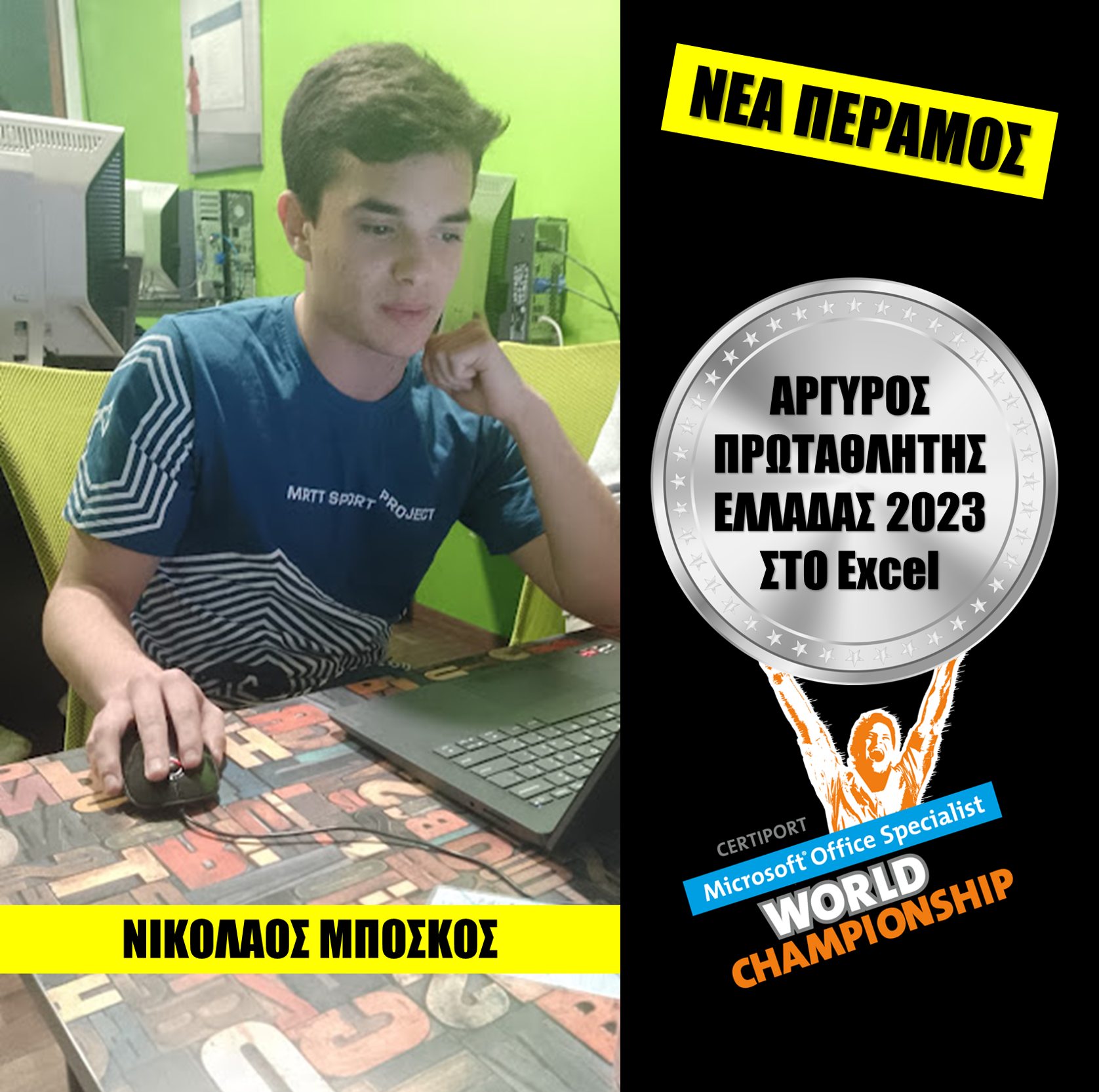 Το τρίτο μετάλλιο για τον νομό Καβάλας κέρδισε ο Νικόλαος Μπόσκος, μαθητής Λυκείου στο Γενικό Λύκειο Περάμου και μαθητής της Σχολής Πληροφορικής ExpertIN. Ο Νικόλαος Μπόσκος είναι ο νέος Αργυρός πρωταθλητής στο Excel. Ο Νίκος έχει διεκδικήσει άλλες δύο φορές μια υψηλή θέση στον διαγωνισμό. Το 2021 είχε τερματίσει στην 8η θέση Πανελλαδικά και το 2022 στην 4η. Ας ευχηθούμε όλοι να είναι ο Νίκος ο επόμενος Πρωταθλητής για την Καβάλα.