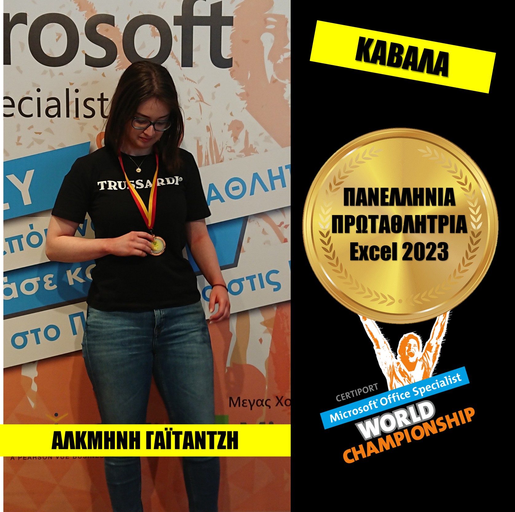 Με το 5ο συνεχόμενο χρυσό μετάλλιο για την Καβάλα επέστρεψε από την Αθήνα η Αλκμήνη Γαϊταντζή. Η Αλκμήνη είναι η νέα πρωταθλήτρια Ελλάδας στο Excel. Ετοιμάζει βαλίτσες για Florida, όπου και θα εκπροσωπήσει την Ελλάδα στο Παγκόσμιο πρωτάθλημα Microsoft Office Specialist.