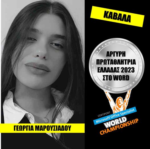 Αργυρή Πρωταθλήτρια Ελλάδας στο Word αναδείχθηκε η Καβαλιώτισσα Γεωργία Μαρουσιάδου. Η Γεωργία είναι φοιτήτρια Πληροφορικής στο ΑΠΘ και μαθήτρια της σχολής Πληροφορικής ExpertIN. Έχει πιστοποιήσει τις γνώσεις της σε βασικό και σε προχωρημένο επίπεδο με πολύ υψηλές βαθμολογίες. Το 2017 είχε τον υψηλότερο βαθμό πτυχίου στην Ελλάδα. Τη φετινή χρονιά ήταν η τρίτη χρονιά που κυνήγησε ένα μετάλλιο, τις δύο προηγούμενες φορές (2019, 2022) είχε τερματίσει στην 4η θέση Πανελλαδικά.